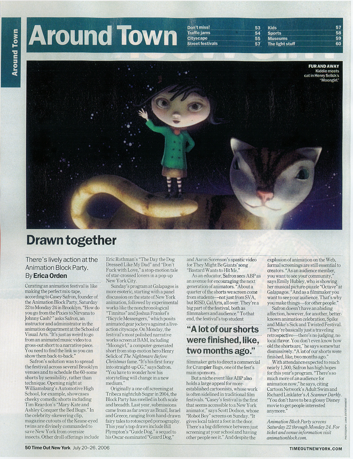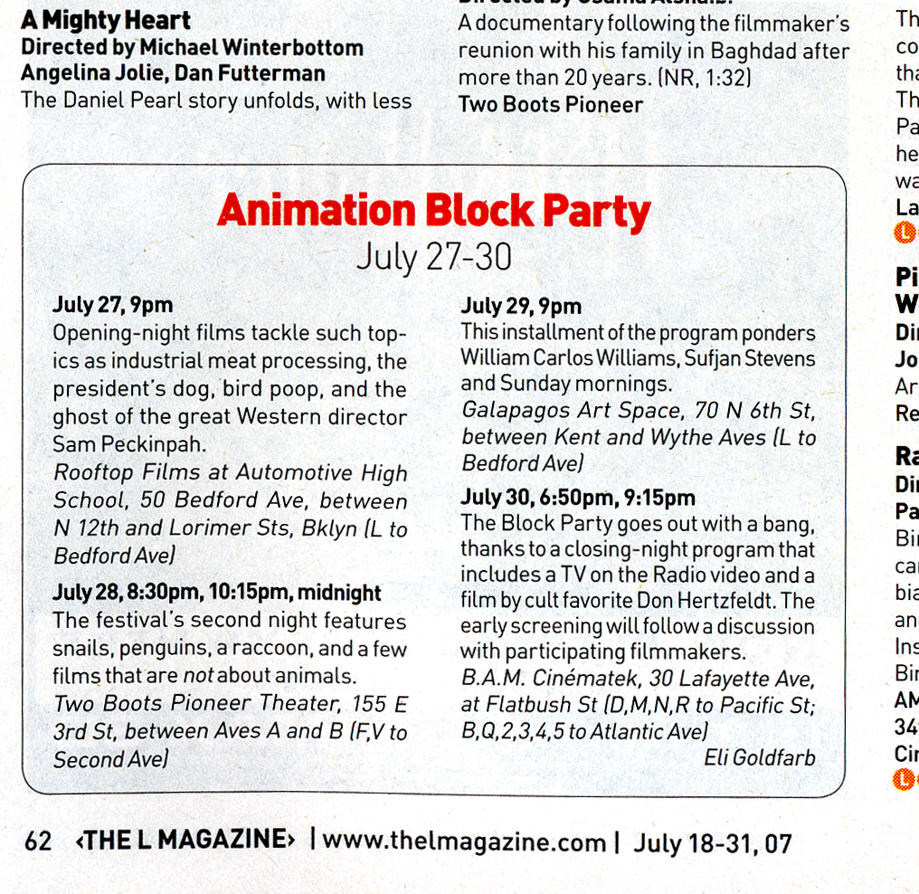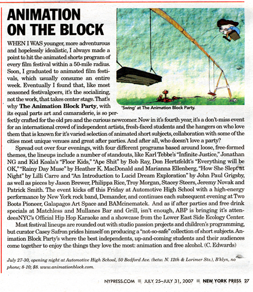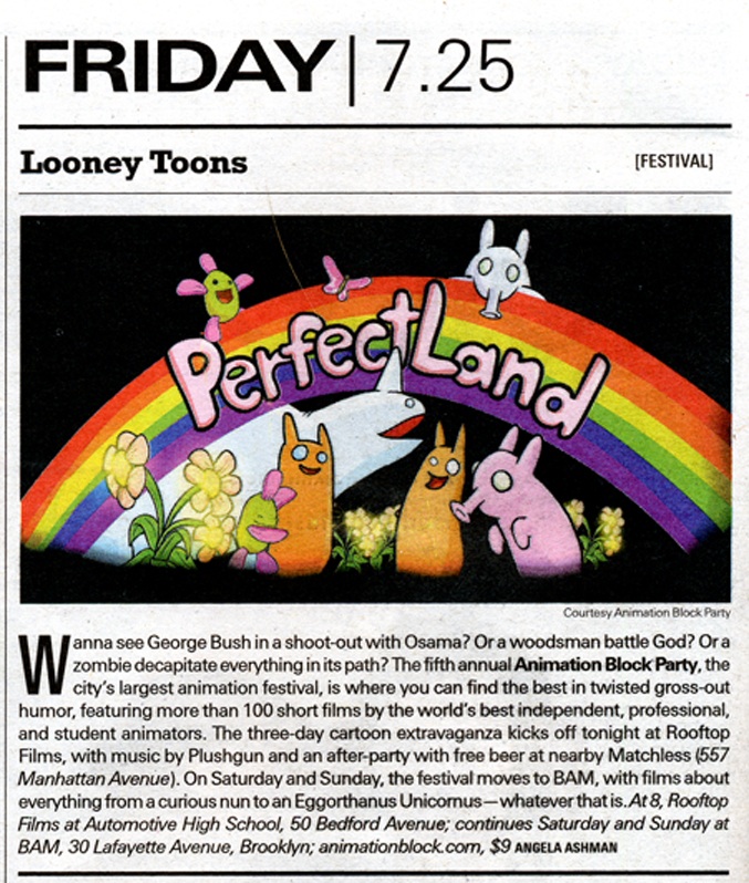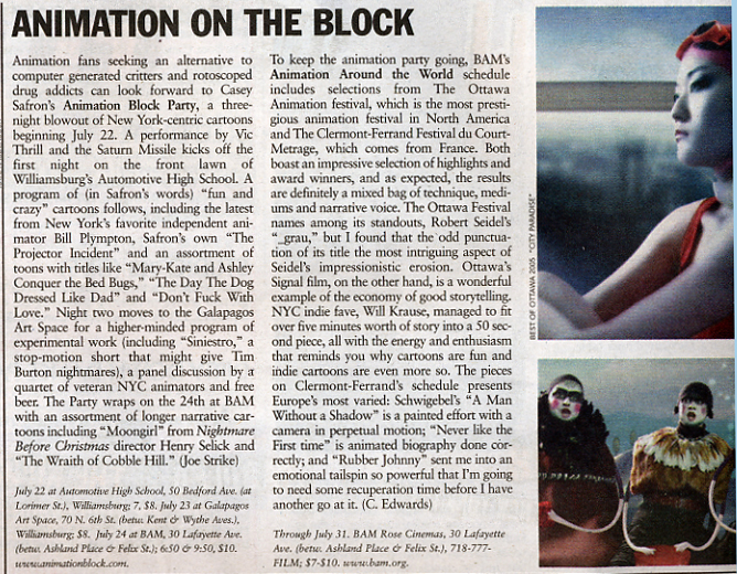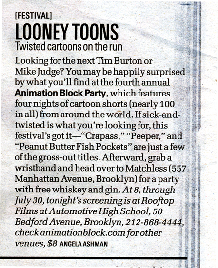 The September 9th, 2004 Animation Block Party received notice in New York Magazine, Animation World Network and Film Threat. Check out the top-five ranking below from New York Magazine.