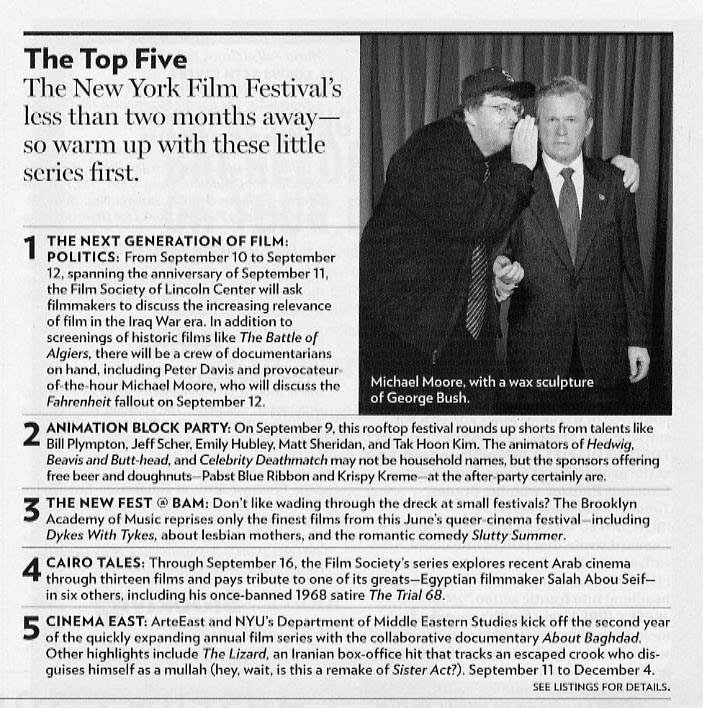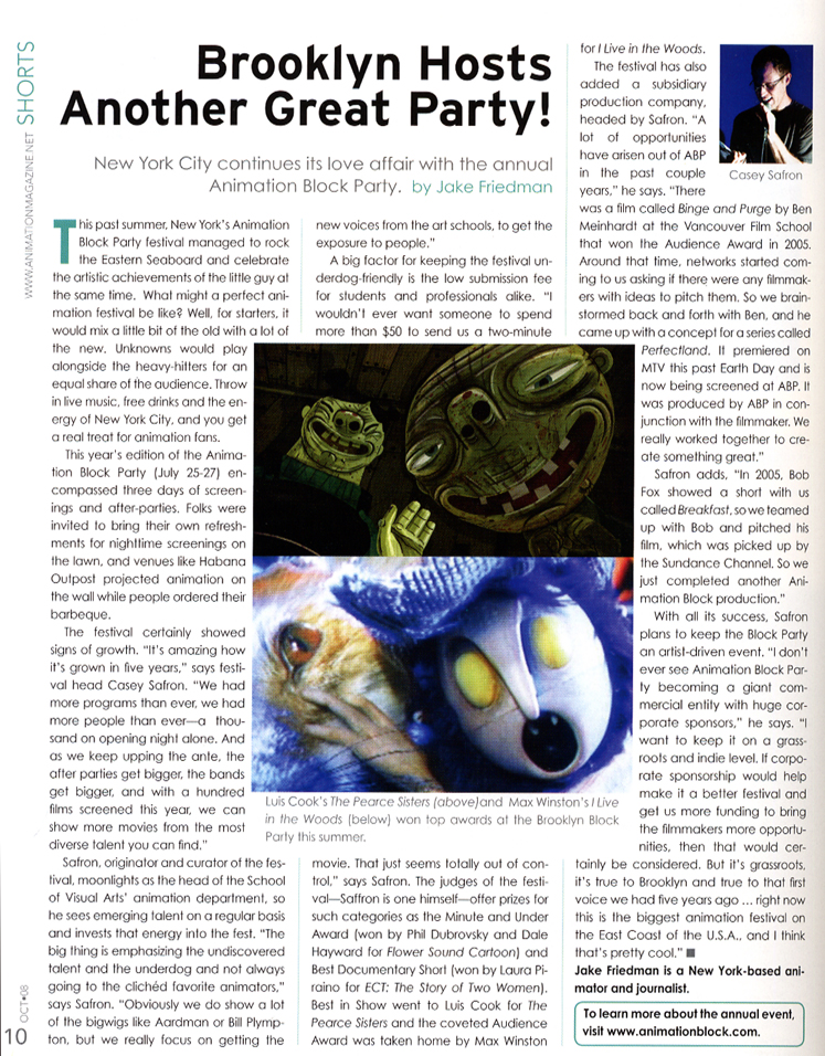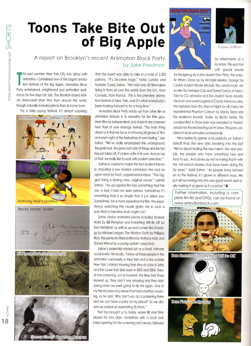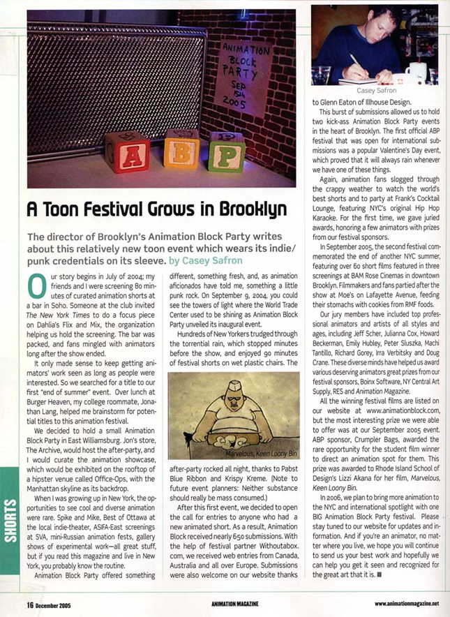 The September 9th, 2004 Animation Block Party received notice in New York Magazine, Animation World Network and Film Threat. Check out the top-five ranking below from New York Magazine.