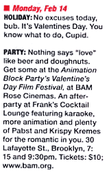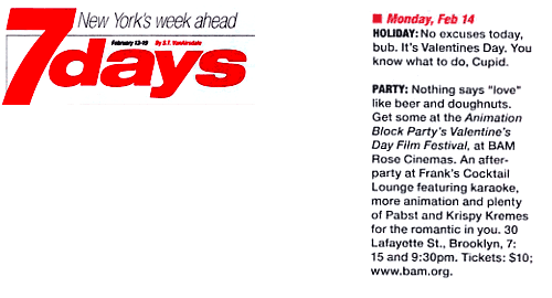 Members of Animation Block Party Valentine jury included: Animation Block Party opened submissions for a Valentine festival in November of 2004. All festival entries were asked to have a "LOVE" theme. With the aid of withoutabox.com and the hard work of the Animation Block staff, over 400 submissions were processed and considered for the February 14th 2005 screening(s) at the BAM Rose Cinemas and Frank's Cocktail Lounge, both in Brooklyn, NY. Nearly 650 animation fans attended Animation Block Party's Valentine edition. The Valentine evening activities began at 5pm with the first of three screenings at the BAM Rose Cinemas and ended around 3am as Frank's Cocktail Lounge closed for the evening. The cold and rainy weather seemed to follow us from the end of summer 2004 Animation Block Party, but goodies from our sponsors eased the winter chill. Party perks included door prizes from Crumpler bags, giveaways from Animation Magazine, lots of Pabst Blue Ribbon, hundreds of Krispy Kreme of doughnuts and much more. On the second floor of Frank's Cocktail Lounge, the Animation Block after-party featured the talents of DJ Harry Ballz and Dynamic Damien, hosting their New York famous version of Hip-Hop Karaoke. The DJ crew completed their set with a perfect rendition of Notorious B.I.G's classic cut, Juicy. A week after the official event, the festival jury was able to get together at Les Sans Culottes on 57th and 2nd to review all the participating films. The jury included Jeff Scher, Howard Beckerman, Emily Hubley, Doug Crane and Machi Tantillo. For more than three hours, the jury debated all the animations over wine and dinner, eventually making some difficult choices, as all the films were first-rate. All festival winners received prizes from our aforementioned sponsors. See below for all the winners of festival honors. Other Valentine event sponsors included Boinx Software, NY Central Art Supply, The Village Voice and RES Magazine. Valentine's Festival Awards